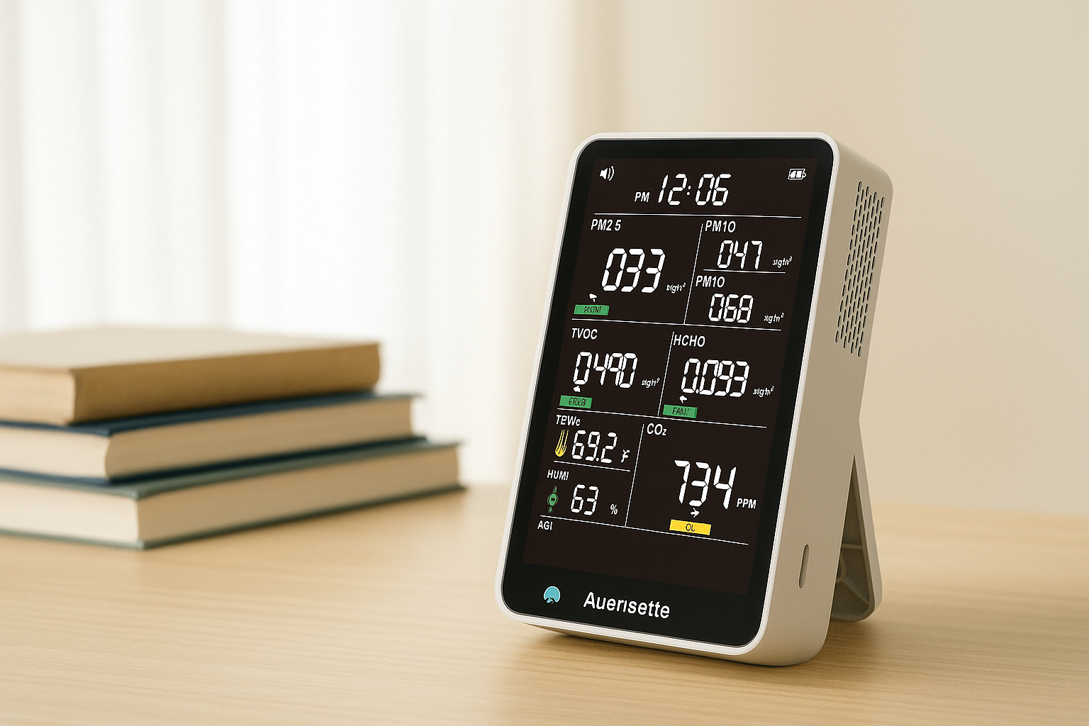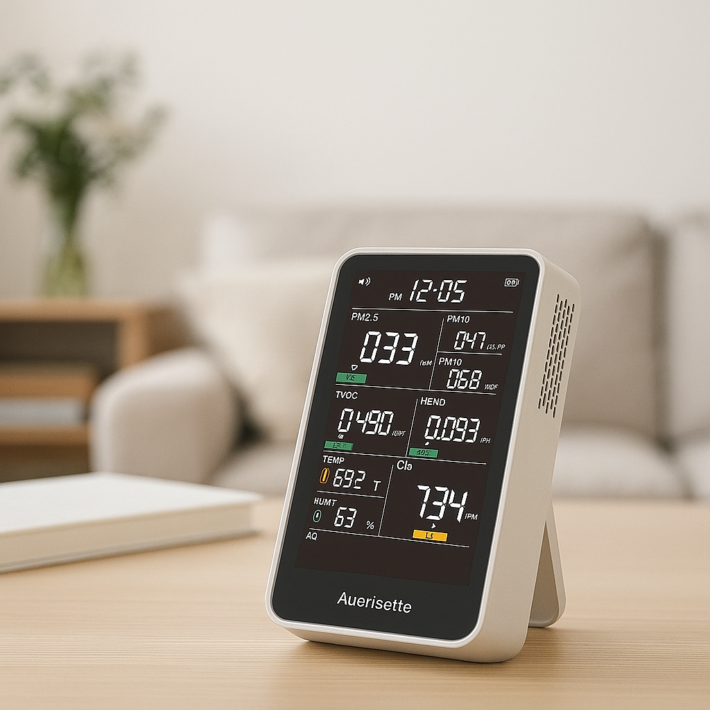 Auerisette tracks PM1.0, PM2.5, PM10, CO2, TVOC, HCHO, temperature, humidity, and more. Its sensor system analyzes data every three seconds and presents the results on an HD display. Color-coded indicators make it easy to understand comfort levels at a glance.
