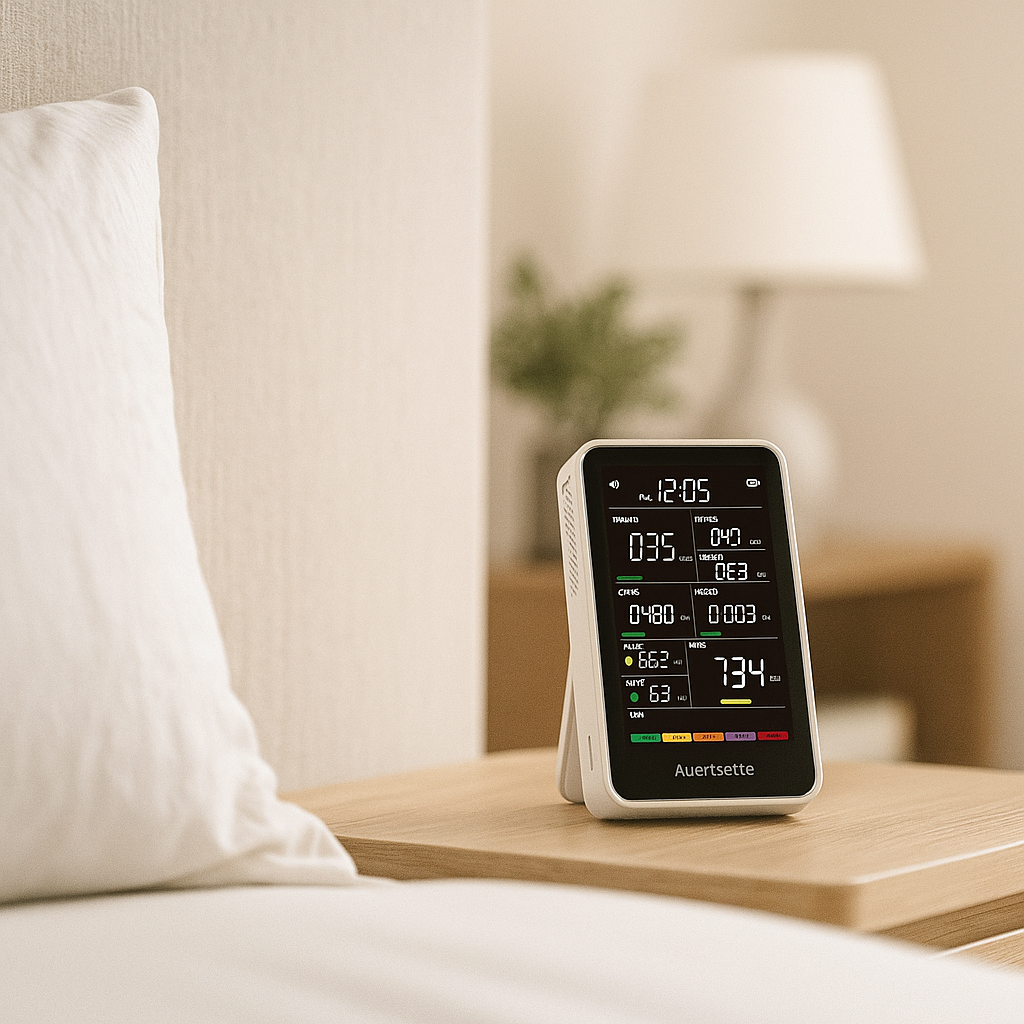 Auerisette is made for those who value harmony at home and at work. The device analyzes the air using precise sensors, showing real-time data clearly on the display. It tracks temperature, CO2 levels, dust particles, humidity, and overall air condition without complex setup. Its modern look and compact design fit naturally into any interior.