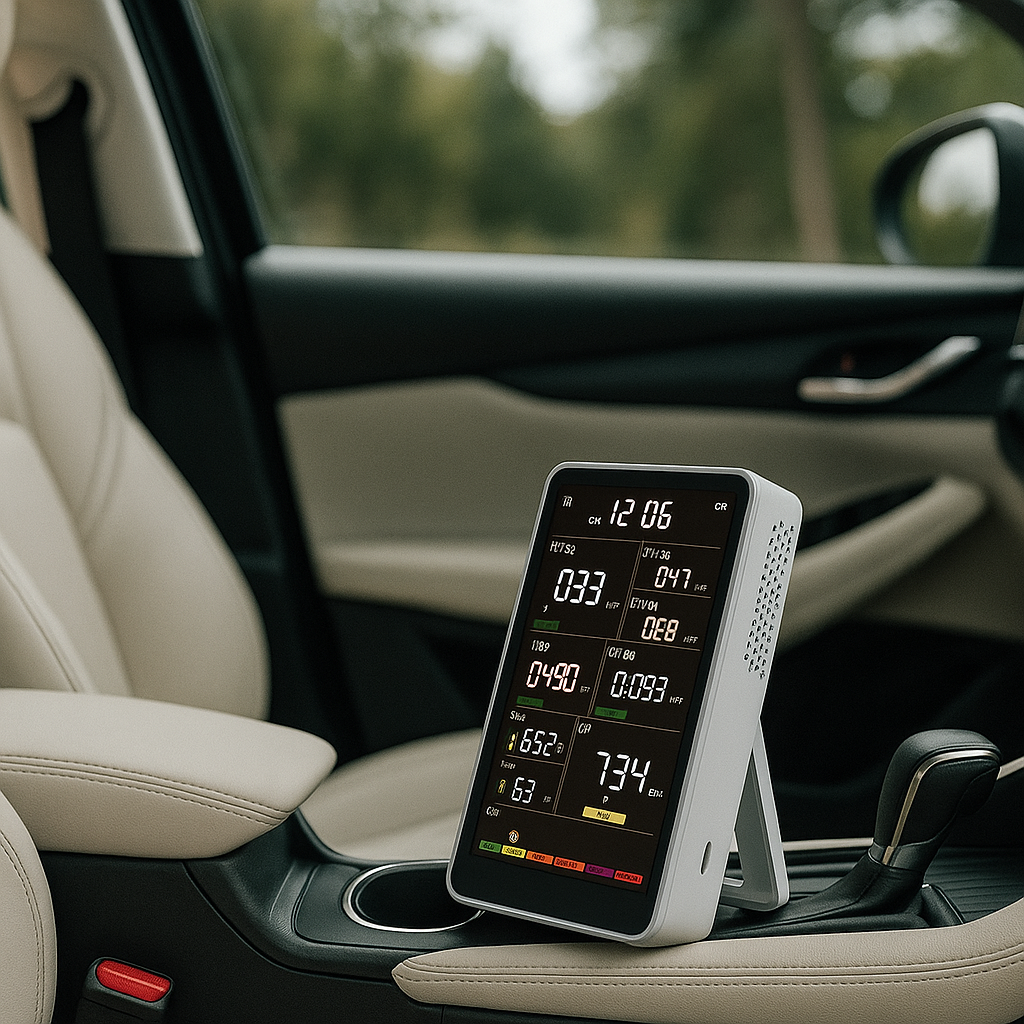 The monitor measures air parameters through a system of high-precision sensors. Each sensor analyzes a specific component — from dust and CO2 to humidity. The data updates every three seconds, and results are displayed on the HD screen.